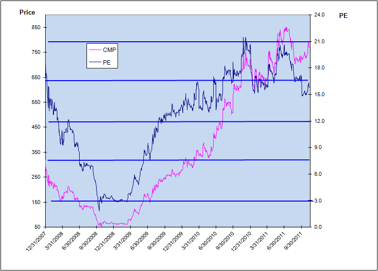 - Over the past 4 years, the average PE of the stock has been 12. However the business is stable and growing, and should be able to command higher PE levels going forward as the business scales up and the market cap moves into the Mid-Cap range.