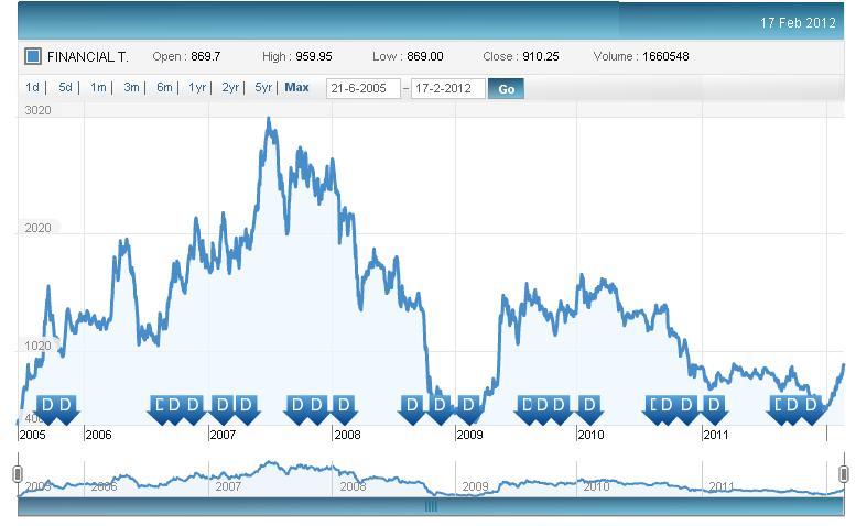 • FT stock also fell in Dec 2011 to a low of 518, before recovering.  Revenues have been inconsistent also. But current price reflects a P/E of 53 times.