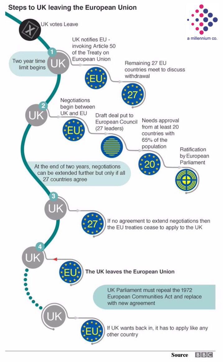 But quitting the EU for UK is not an automatic process. It has to be negotiated with the remaining members. These negotiations are meant to be completed within 2 years but the European Parliament has a veto over any new agreement formalizing the relationship between the UK and the EU. What will happen is difficult to predict. A flow chart from BBC captures the next steps for UK and European Union: