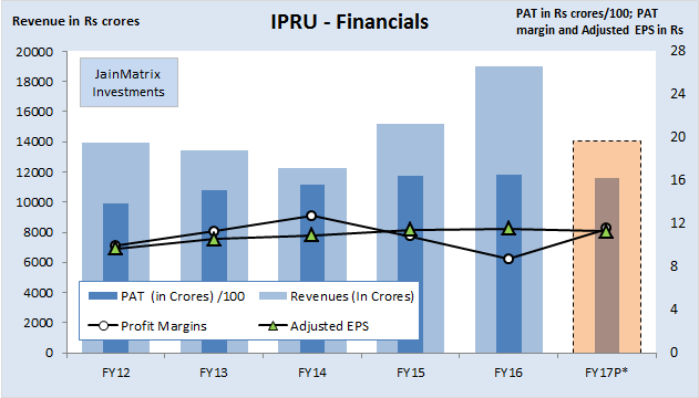 - IPRU had revenues and profits of Rs 18,999 cr. and Rs 1,653 cr. resp. in FY16. Its revenue and PAT have grown just 8.1%, and 4.5% CAGR from FY12 to FY16.