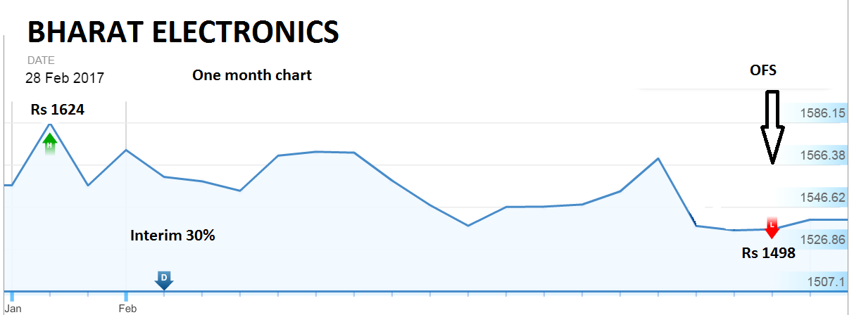OFS Application dates were from 22-23rd Feb with only the second day for Retail. Govt of India sold 1.11 cr. equity shares – 5.0% of stake in BEL, through the OFS route. This was done to meet FY17 divestment targets. The shareholding was 74.4% which has come down to 69.4% after the OFS. The OFS floor price was Rs 1,498; 20% of OFS offer was reserved for Retail, who also got 5% discount. See detailed OFS report: Bharat Electronics – A Value BUY