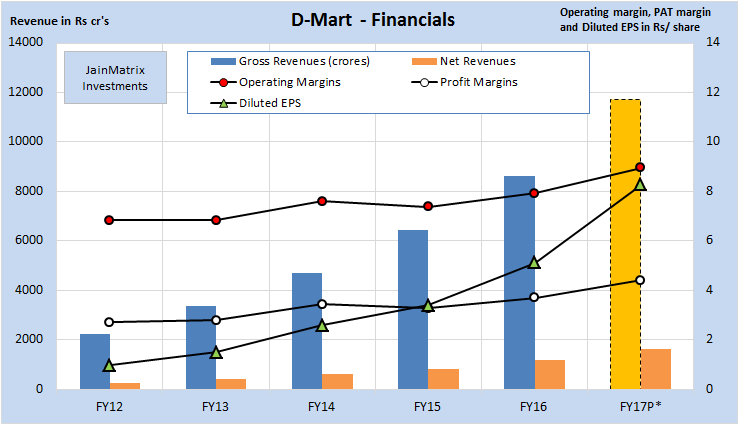 • Overview: D-Mart is an emerging national supermarket chain, with a focus on value retailing. Total income for FY16 was Rs 8,606 cr. and net profit Rs 319 cr. Its revenues, EBITDA and PAT have grown at 40.3%, 45.5% and 51.6% resp. CAGR over 5 yrs. It has 118 stores with total retailing area of 35.9 lakh sq.ft. It has a low employee count and uses contract staff to contain costs.