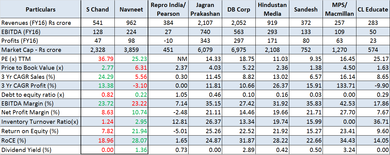 • PE for SCL appears expensive at an FY17P* of 36.8 as compared to Navneet at 25.2 times with better financials. The valuation of SCL is moderate in terms of P/B ratio.