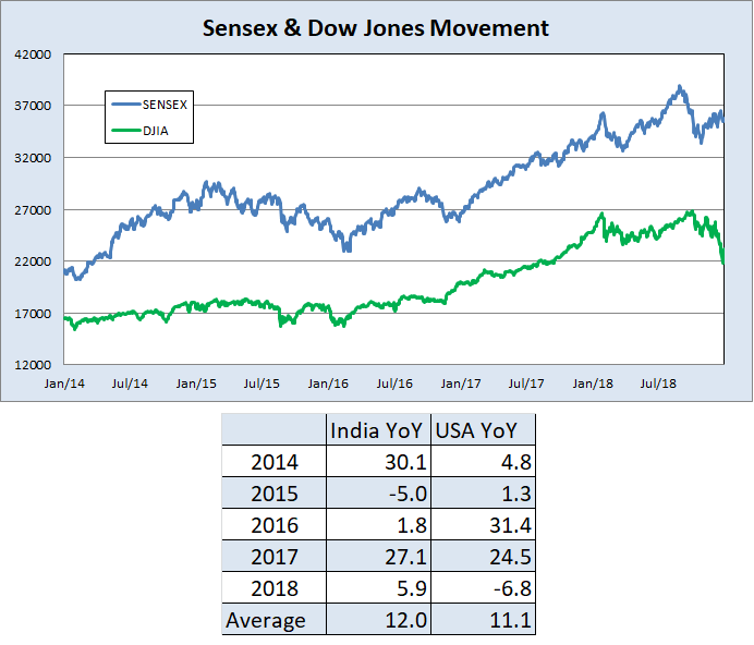 - A look at Dow Jones Industrial Average (USA) and Sensex, see Fig 3, indicates that over the longer term there is a similar pattern. However in the shorter duration the movements could be more influenced by domestic factors playing out.