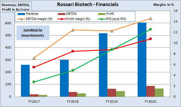- Overview: Rossari Biotech is a leading Indian textile and specialty chemical firm. Revenues, EBITDA and profit for FY20 were ₹ 603.8 cr., ₹ 105 cr. and ₹ 65 cr. resp., and grew at 32.3%, 67.6% and 66 % resp. over the last 3 years. Rossari has seen a rapid growth in recent times, and has a balanced product portfolio and a large number of domestic customers. Growth plans look promising with the planned Dahej plant. The debt is low, and balance sheet looks healthy with good return ratios. Expansion plans have been funded mostly from internal cash generation. The firm is small but looks nimble in terms of product formulations, R&D, new export markets, etc. At a P/E of 30.7 times FY20 earnings, the valuation is expensive. However the current growth rates justify this valuation.