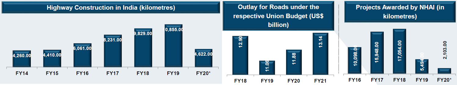 - Highway construction in India increased at 21.4% CAGR between FY16-19. In FY19, 10,855 km were constructed, and GoI has set a target for constructing 12,000 km of NH in FY20.