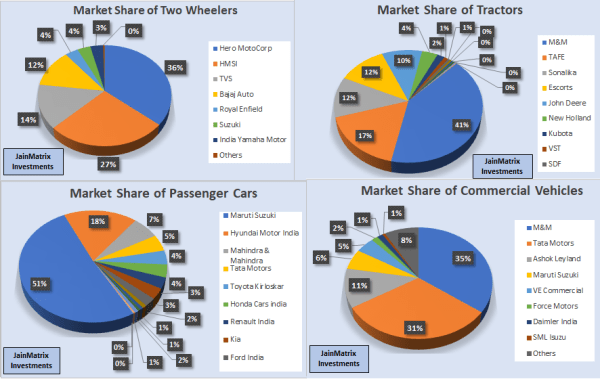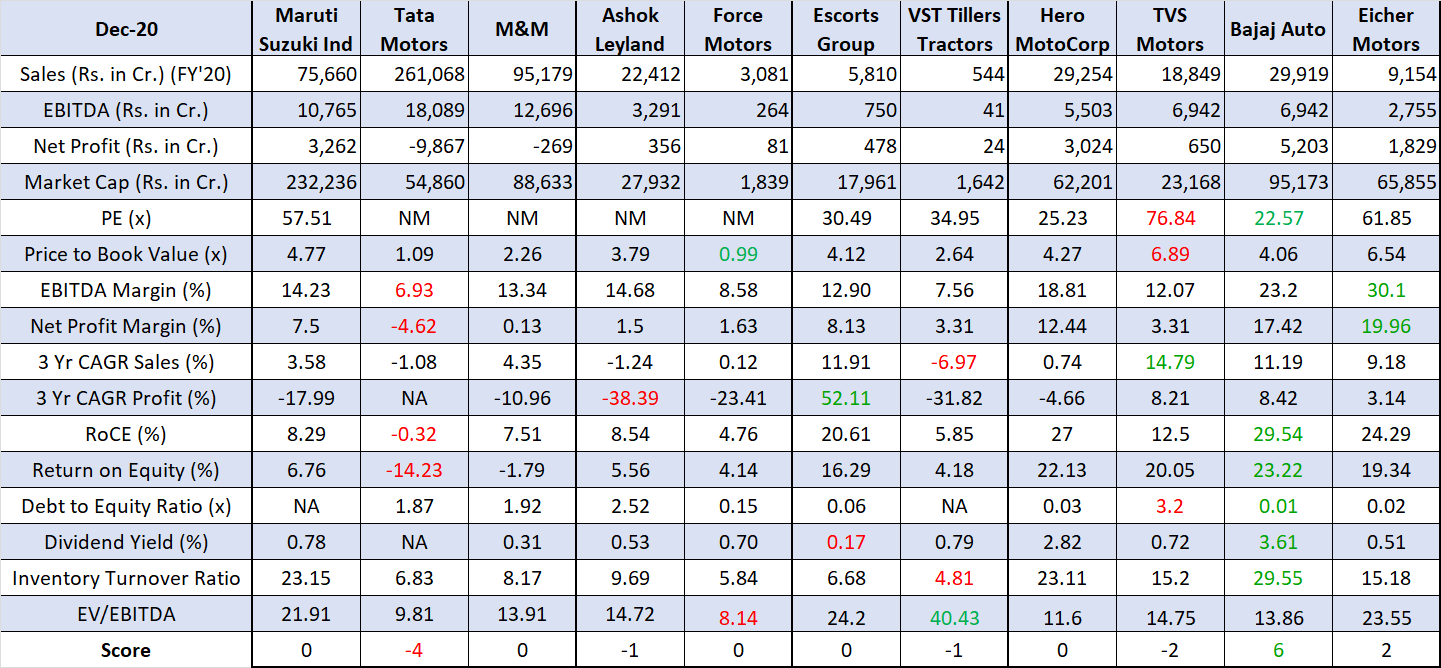 - Among these auto companies, the best positive outcomes and Score are of Bajaj Auto and Eicher Motors in two-wheeler segment, Escorts in Tractors and Maruti Suzuki in Passenger Car segment. TVS Motors and Tata Motors appear weak from this group.