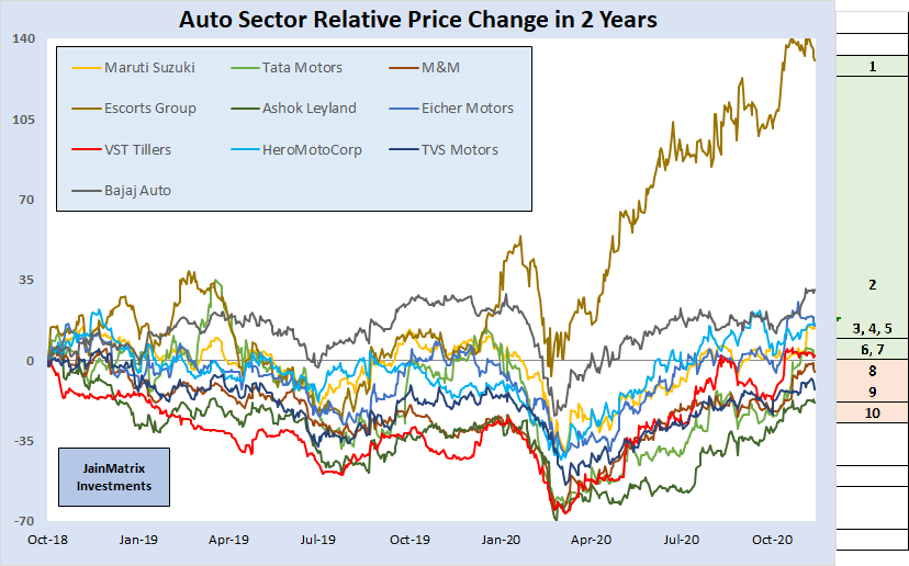 - In the group #2 is Bajaj Auto, #3 is Eicher Motors, #4 is Hero Motocorp, and #5 is Maruti Suzuki. Relative underperformers are Ashok Leyland, Tata Motors and TVS Motors.