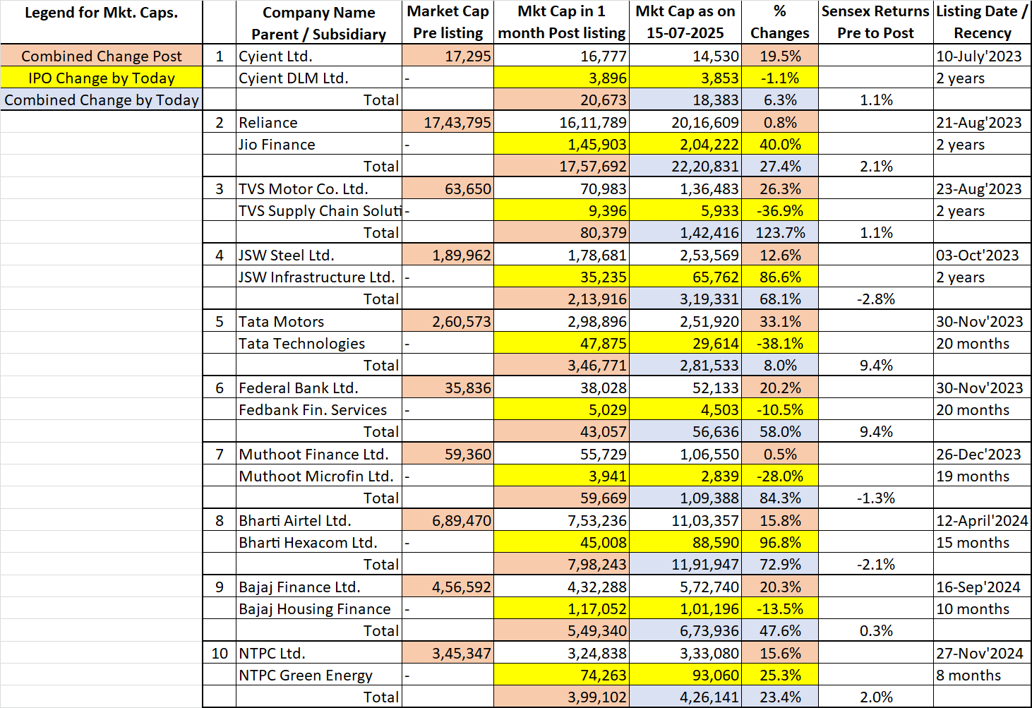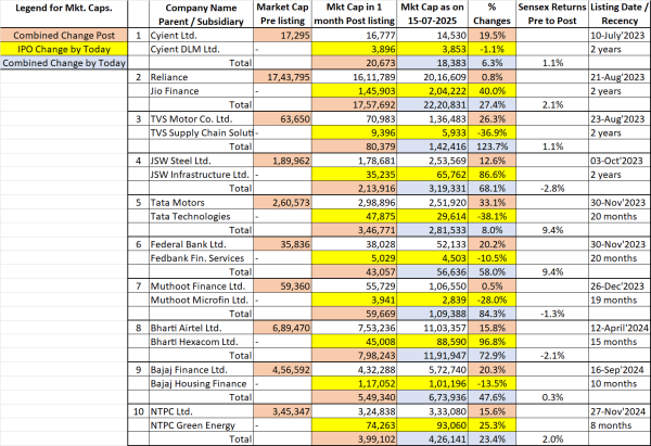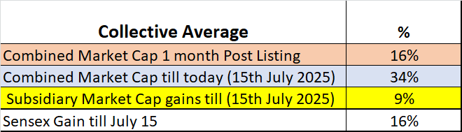 We identified 10 IPOs over the last 2 years, of subsidiaries of well known, listed, Corporates. We share the Market Capitalization data over this period (Jul’23 – Jul’25) at three key timelines – See Table 1: