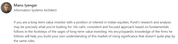 - I have known Punit for over 7 years now and his qualifications and knowledge of the Indian stock market is fairly mature. Considering the fact that he is a SEBI certified Research Analyst, it gives me all the more confidence in his thorough research material and suggestions for long term investments. My portfolio has consistently given market beating returns from the time I have taken membership of his premium reports and services. Punit has a very warm and approachable personality and is ever willing to help others achieve financial stability. I wish him greater success in his endeavors and would love to emulate his success mantras through my investments too!