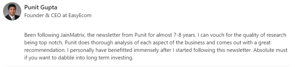 I’m proud that JainMatrix Investment reports are trusted by readers. Here are some freely expressed testimonials from subscribers and readers on my website: