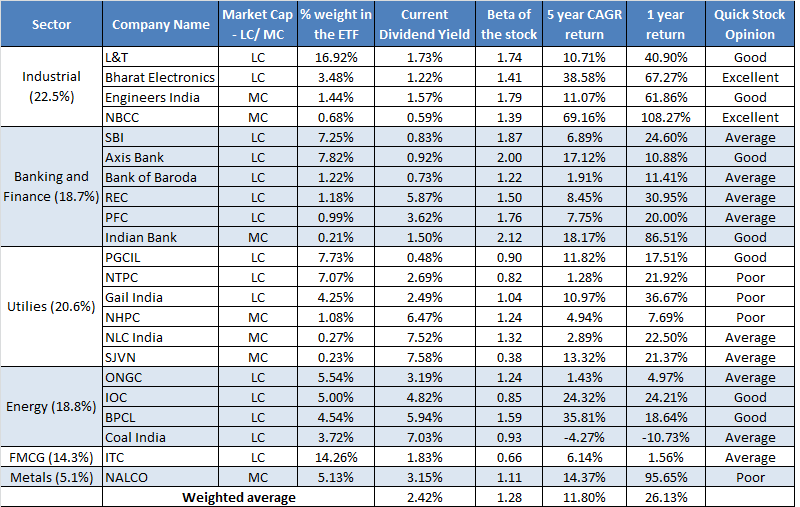 - Ten leading PSUs’ will be included in this ETF. Typically these are fairly well known high dividend, low capital gains but asset rich companies.
