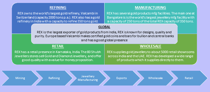 - The REX group with this acquisition now straddles across the Gold value chain. The strengths are Refining, Jewellery Manufacturing and Wholesale. The weaker spots needing investment are Mining and Retail.
