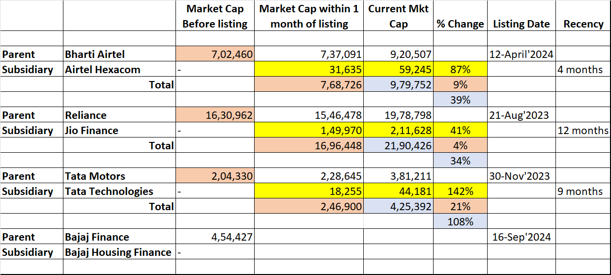 The listing of subsidiaries happens at current market valuations and can unlock good value immediately for the parent firm, which may have a conglomerate discount applicable or a complex structure, not so for the subsidiary.