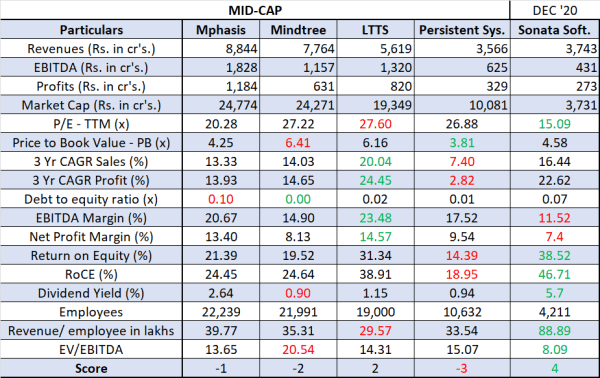 - Among mid-caps, Mphasis has the highest revenues or sales, followed by Mindtree.