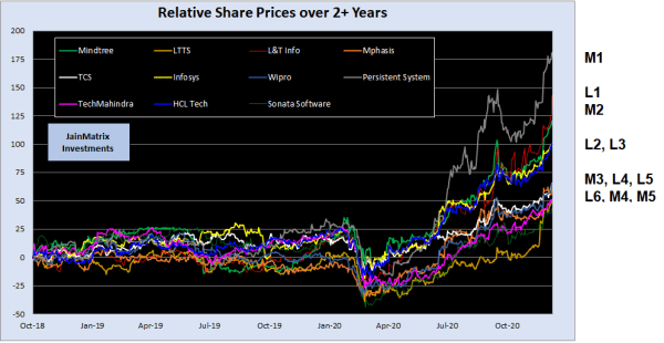 - The graph in Fig 2 – Relative Share shows the stock returns given by listed Indian IT Services firms over Oct’18 – Jan’21.